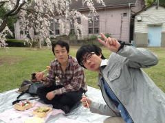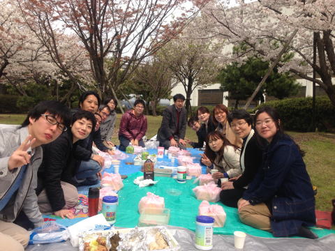 今年度は当研究室では、学部4年生の伊藤君、西原君、日野君の3人を新入生として迎え入れました。これをお祝いして、新入生歓迎会を構内の花見スポットで行いました。