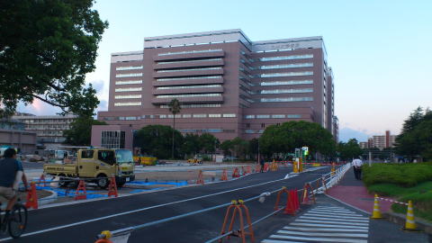 こちらが、九州大学病院。1275床の巨大病院です。この病院を中心として、関連施設や研究棟などが立ち並び、