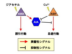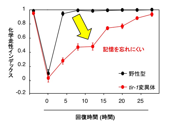 学習は、記憶の形成、保持、想起、消去など様々な過程から成り立っている複雑なシステムです。私達の研究室ではは、線虫C. elegansを用いて、短期記憶の消去の分子機構を明らかにする目的で、「記憶を忘れない」変異体の解析を開始しました。ジアセチルに対する応答や順応には異常はないが、順応からの回復が見られない変異体を単離しました。その解析から、ある感覚ニューロンから忘却を促すシグナルがでていることが明らかになりました。