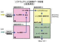 右の図は、対物レンズを高速に動かすことができる高速共焦点顕微鏡の外観。左下の図は、得られた画像の解析方法。右下の図は、多数の中枢神経系のニューロンにおいて、神経活動を測定した画像。赤いところは、活動している神経細胞を表しています。