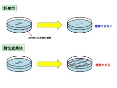 野生型は20mM、30mM塩化リチウムを含む培地では増殖できません。そこで、変異誘起した集団の中から塩化リチウムを含む培地でも増殖できる突然変異体をスクリーニングし、その原因遺伝子の同定を行っています。その結果、現在7つの遺伝子が得られています。