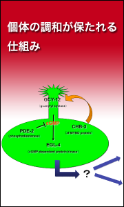 の神経回路上での情報処理のメカニズムやそれに基づいた発生やホメオスタシスのメカニズムに興味を持って、主に遺伝学的な研究を進めています。遺伝学的な解析では、生命現象と遺伝子を、変異体を介して直接結びつけることができます。このことを利用して、行動やホメオスタシスといった複雑な生命現象と遺伝子とを結びつけ、さらにその間の関係を行動・形態・神経活動・代謝などの詳細な解析から明らかにしていくことで、新しいシステムを発見することを目指しています。