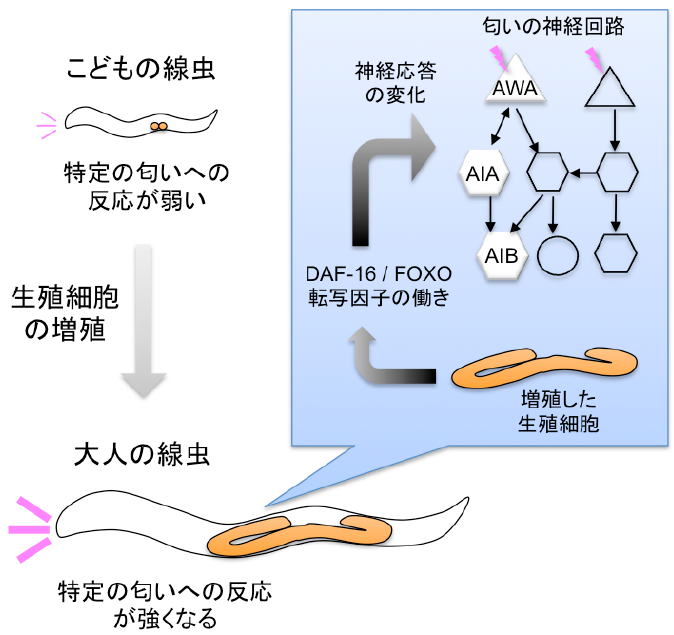 多くの動物は成長段階に応じて行動パターンを変化させることが知られていますが、そのような行動変化の制御機構はほとんど分かっていません。研究グループは今回、こどもの線虫と大人になった線虫では匂いの好みに違いがあることを明らかにしました。線虫は卵からふ化後、大人になるまでの間に生殖細胞が増殖して性的な成熟が起こります。生殖細胞の増殖を人為的に止めて生殖細胞を持たない大人の線虫を作ると、匂いの好みがこどもの時のままであることが分かりました。