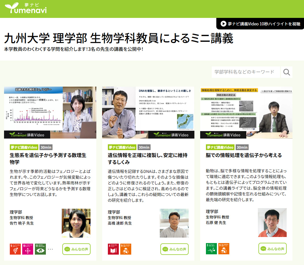 「夢ナビ」に数理生物学研究室の佐竹教授、染色体機能学研究室の高橋教授、分子遺伝学研究室の石原教授が登場しています。