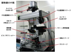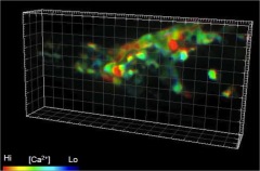 右の図は、対物レンズを高速に動かすことができる高速共焦点顕微鏡の外観。左下の図は、得られた画像の解析方法。右下の図は、多数の中枢神経系のニューロンにおいて、神経活動を測定した画像。赤いところは、活動している神経細胞を表しています。