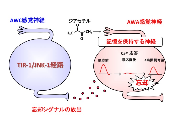 学習は、記憶の形成、保持、想起、消去など様々な過程から成り立っている複雑なシステムです。私達の研究室ではは、線虫C. elegansを用いて、短期記憶の消去の分子機構を明らかにする目的で、「記憶を忘れない」変異体の解析を開始しました。ジアセチルに対する応答や順応には異常はないが、順応からの回復が見られない変異体を単離しました。その解析から、ある感覚ニューロンから忘却を促すシグナルがでていることが明らかになりました。