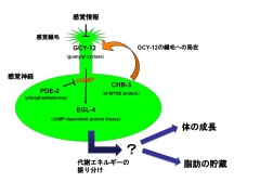 私たちのこれまでの解析によって、この調節にかかわる信号伝達物質が次々と同定されており。感覚情報に依存した体のサイズや脂肪貯蔵量の調節の仕組みが明らかになりつつあります。
