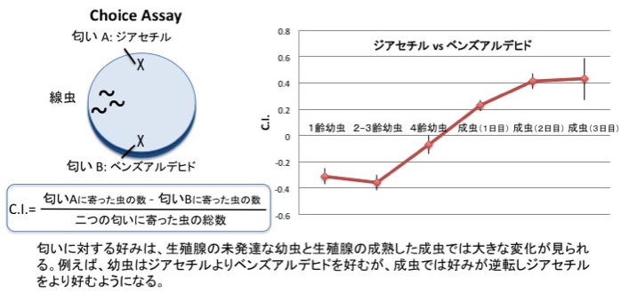 線虫はいろいろな匂いに対して寄っていく性質がありますが、二つの匂いを提示してどちらにより寄っていくかを調べたところ、幼虫と成虫では匂いの好みに変化があることがわかりました。下の図のように、幼虫に比べて成虫はジアセチルをより強く好むようになります。