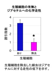 このような匂いの好みの変化のメカニズムを調べるために、私たちは成虫の生殖細胞を人為的に取り除く実験をしてみました。すると、成虫でもジアセチルに対する創世の低下を示すことが分かりました(右図)。