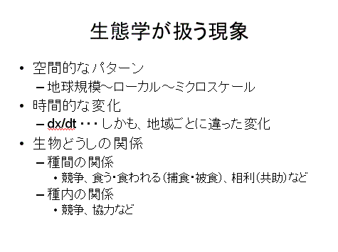 さまざまな生物現象の、空間的・時間的な変化を理解するには、生物どうしの関係についての研究が欠かせない。生物どうしの関係についての研究では、「進化」と「適応」という視点が重要になる。この点は、次回の講義でとりあげる。