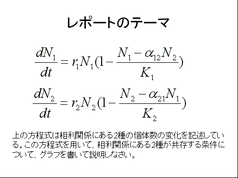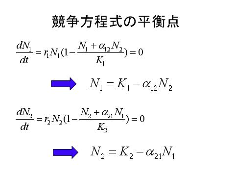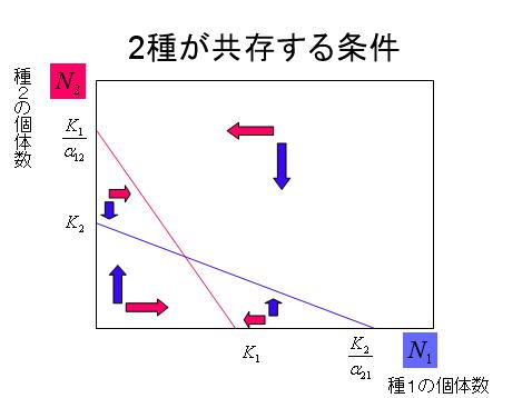 K1=K2という場合を考えると、2種が共存する条件は、α12,α21がともに1より小さいときである。すなわち、種間競争の効果が種内競争の効果(=1)よりも小さいときに、2種は共存できる。たとえば、同種の個体どうしが集中して分布する傾向が強いときには、種内競争が卓越するので、2種は共存しやすい。