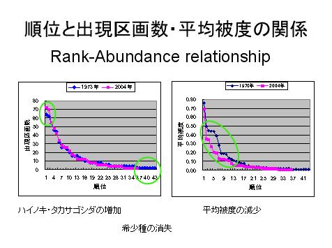 出現区画数や被度のように、種の豊富さをあらわす量を、生態学ではアバンダンスと言う。上の図のような関係は、アバンダンス・ランク関係と呼ばれる。アバンダンスが種の順位(ランク)に対してどのように変化するかは、生物群集の性質をあらわす重要なパターンである。
