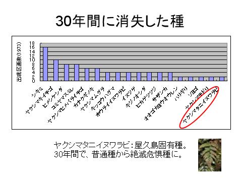 ■図4:「天文の森」試験地中央のライン(2×100m)50地点では、30年間に17種の植物が消失していた。この中には、屋久島固有種のヤクシマタニイヌワラビが含まれている。ヤクシマタニイヌワラビは、かつては屋久島のスギ林内にふつうに見られたが、現在では絶滅寸前の状態である。ヤクシマタニイヌワラビはなぜそれほど減ってしまったのだろうか。天然林の中で、林床植生は、なぜ減ってしまったのだろうか。