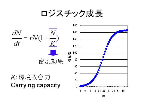 このようなモデルは、ロジスチックモデルと呼ばれる。ロジスチックモデルの下での個体数の増加(ロジスチック成長)は、図のようにS字型となり、やがてKに近づく。