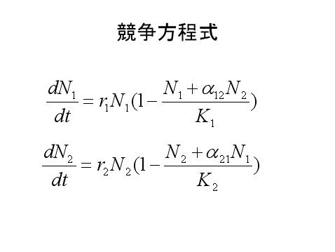 α12,α21は競争係数と呼ばれ、種内競争に対して種間競争がどの程度強いかをあらわす。