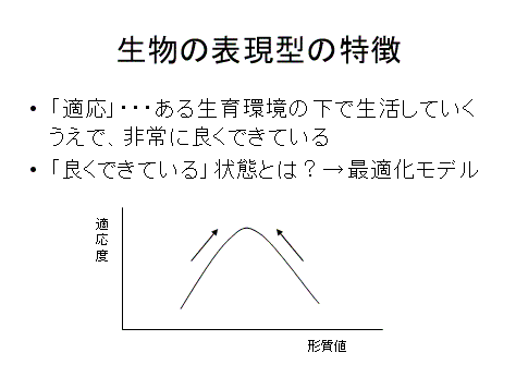 ■個体の「適応度」と「形質値」(たとえば花の大きさや嘴の大きさ)の間に何らかの関係があれば(たとえば、大きな嘴を持つ個体ほど適応度が高ければ)、「適応度」が高い状態へと進化が進む。「適応度」と「形質値」の関係が、図のように上に凸の曲線であらわされる場合には、形質は適応度がもっとも高い状態へと進化する。この状態は、最適化モデルで予測できる。