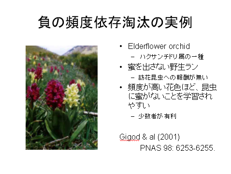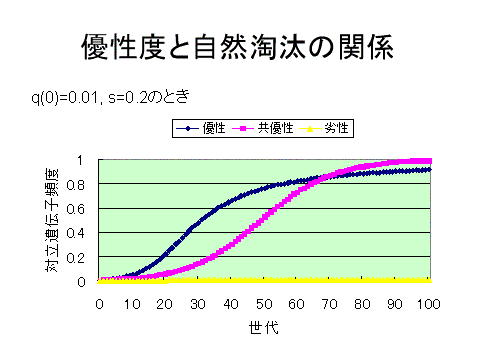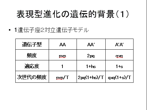 ■たとえば、A'A'が白花で、マルハナバチに好まれるために、黄花のAAよりも適応度が高いとしよう。この関係をあらわすには、AAの適応度を1、A'A'の適応度を 1+s とすれば良い。s は、自然淘汰上の有利さの程度をあらわす量であり、淘汰係数(選択係数)と呼ばれる。AA'の適応度は、その表現型が白か、黄色か、それともその中間かによって異なる。白の場合には1+s, 黄色の場合には1である。その中間の場合には、1+hs とあらわすことができる。hは0と1の間をとる量であり、優性度と呼ばれる。