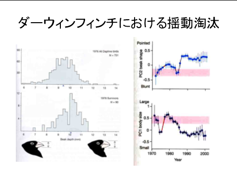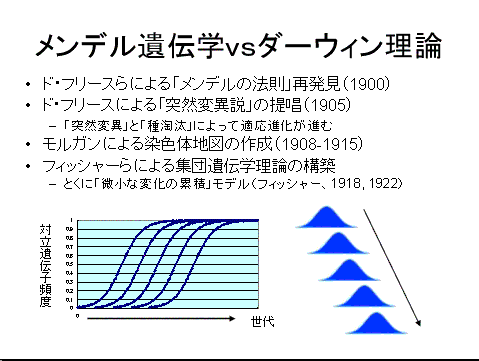 ■図4:メンデルの法則が再発見され、メンデル遺伝学が発展する過程では、ダーウィンの考えと、メンデル遺伝学が対立するかのように考えられた時期がある。この2つの考え方を統一したのが、フィッシャーの「微小な変化の蓄積」モデルである。このモデルによれば、量的な形質の進化は、微小な表現型効果を持つ対立遺伝子が次々に置き換わる過程を通じて、起きる。