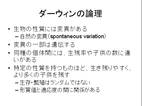 ■図2:「適応度」が高い状態へ形質が進化する機構は、「自然淘汰」(または自然選択)と呼ばれる。この機構をはじめて論理的に説明したのは、ダーウィンである。ダーウィンの論理は、4つの「公理」から成り立っている。