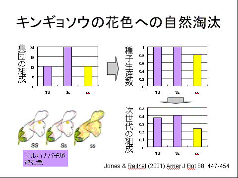■図5:自然淘汰のプロセスは、実験的に検証することができる。図に示された野外実験では、白花個体がマルハナバチに好まれるために、自然淘汰によって対立遺伝子Sが増加したことを示している。