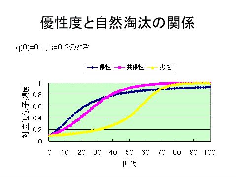 ■有利な突然変異A'が集団全体に広がると、Aの頻度が低くなり、ホモ接合AAはごく稀になる。A'が優性の場合には、Aが劣性なので、ホモ接合AAの場合に限って淘汰を受ける。その機会はごく稀なので、A'は集団全体をしめることができない。A'が共優性の場合には、へテロ接合でもAの表現型効果があらわれるので、淘汰が有効に作用し、A'がほぼ集団全体をしめることができる。