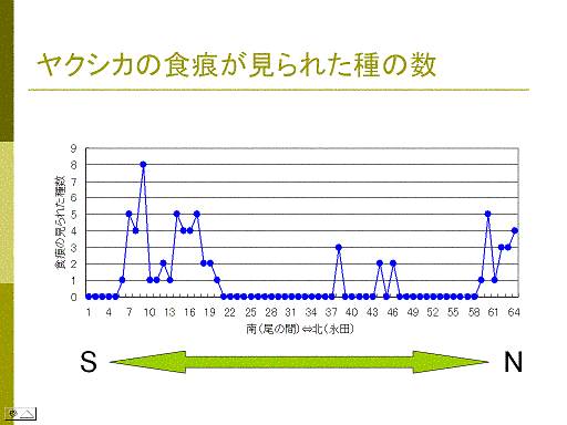 ■左の図は、尾の間〜宮之浦岳〜永田歩道に至る64地点における、ヤクシカの食痕の分布を示したものである。南斜面と北斜面で傾向が異なり、尾の間歩道では、中間標高地の地点6−20にかけて食痕が見られ、永田歩道では低標高地に食痕が見られた。