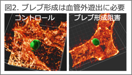 (※2) 血管外遊出・・・血管内を流れてきた細胞が血管壁を通りぬけ、血管の外の組織へ移動する現象。がん転移や免疫細胞の移動、発生過程におけるPGCの移動などで重要な過程。